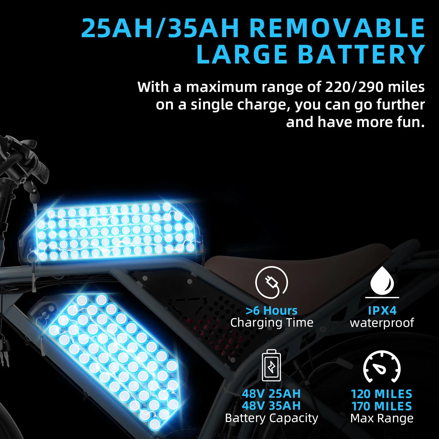 - Removable 48V batteries in 25Ah, 35Ah, and 60Ah tailor range: roughly 31-50 miles (25Ah), 50-68 miles (35Ah), and up to 110-120 miles (60Ah) depending on mode.